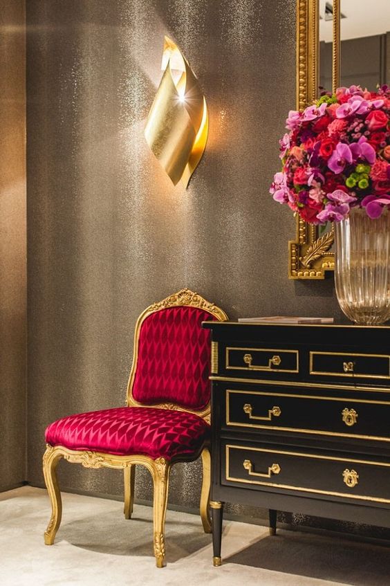 Escolha móveis espelhados, como uma mesa de console com detalhes em vidro e metal. Use tons de prata e ouro para realçar o glamour.