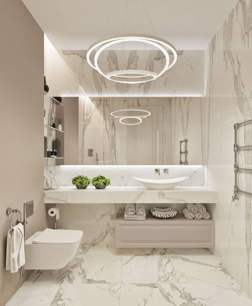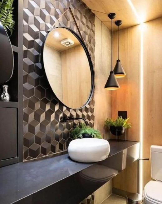 Banheiro moderno com luminária é uma excelente opção para ambientes mais contemporâneos e que gostem de apostar no atual.